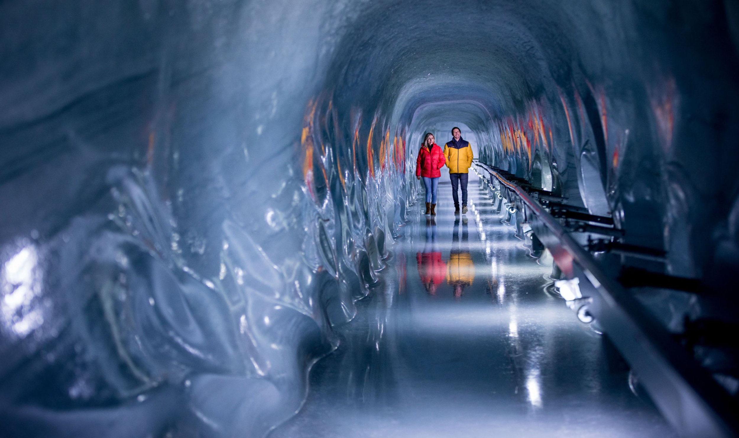 The tunnel leading up from the station Eigergletscher is seven kilometres in length and was built between 1896 and 1912. One stop within the tunnel offers spectacular views onto the glacier world outside through windows in the Eiger North Face. On the summit, visitors are greeted by a high-Alpine wonder world made of ice, snow and rocks. All of this can be marvelled at from the viewing platforms “Sphinx” and “Plateau” on the Aletsch glacier or from the “Ice Palace”.